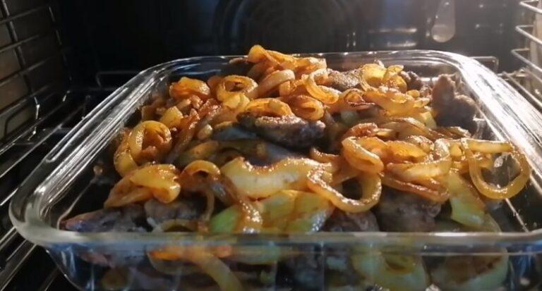 У форму для запікання викласти шарами яблука та печінку, зверху розподілити обсмажену цибулю. Запікати в духовці при 180 °C близько 20 хвилин.