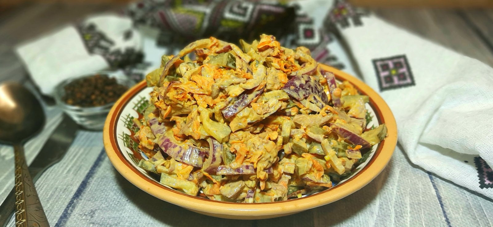 - В місткості з’єднуємо всі інгредієнти печінку, моркву, цибулю, огірок. Солимо до смаку. Заправляємо соусом, перемішуємо і подаємо до столу).
