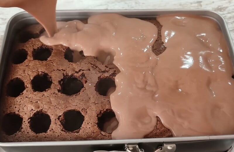 Готовий бісквіт трохи остудіть, дістаньте з форми й за допомогою горлечка пляшки зробіть отвори по всій поверхні. Після цього поверніть пиріг у форму.
