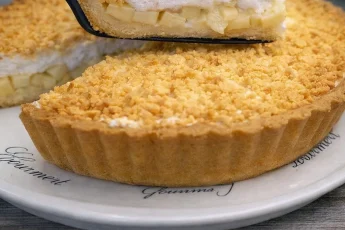 Залишки бісквіту подрібніть у крихту та посипте нею поверхню пирога. Подавайте десерт без форми.