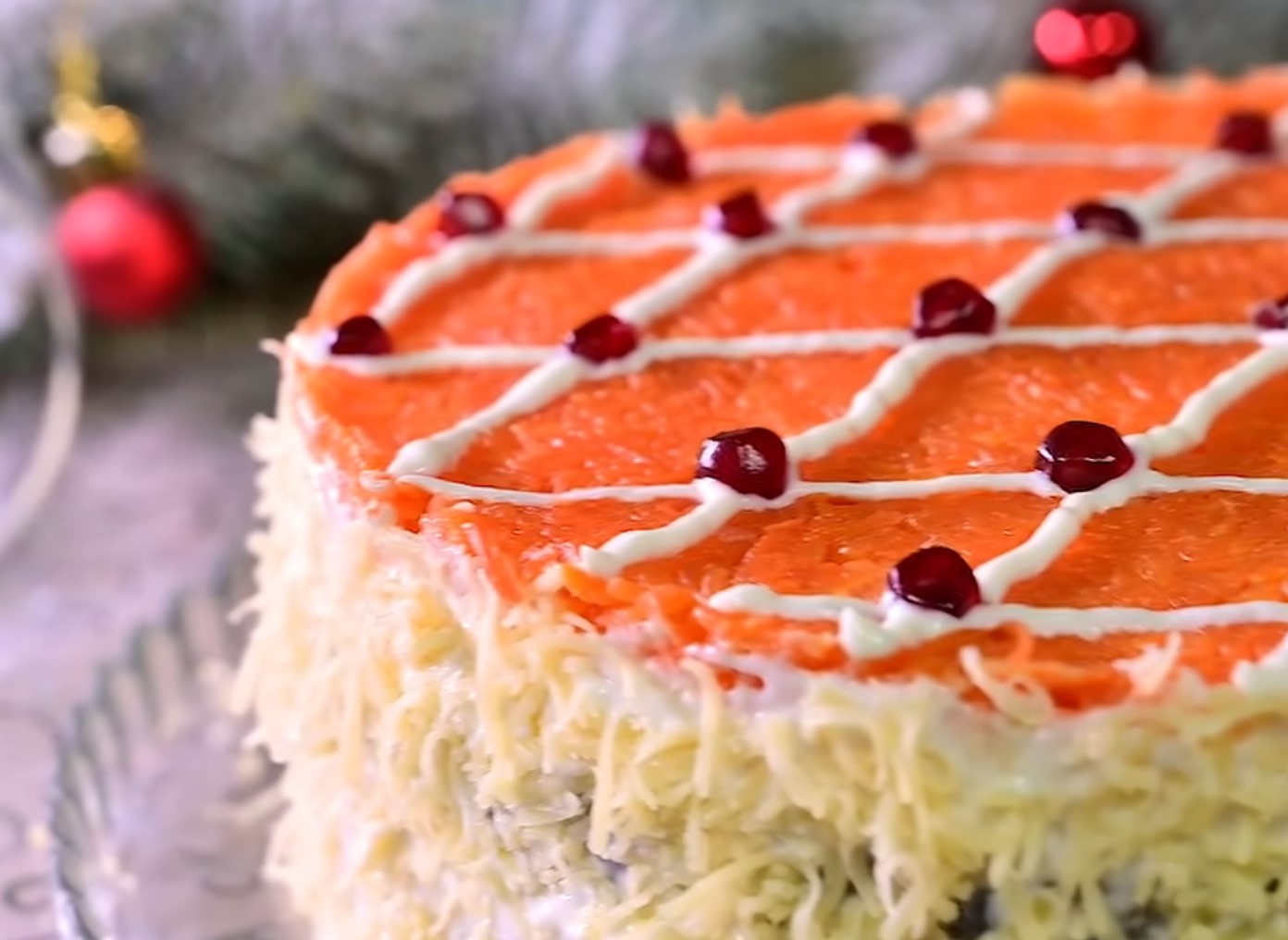 - Натерти сир, змастити його майонезом. Зверху викласти натерту моркву та знову покрити майонезом.