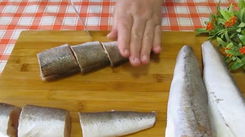 Рибу очищаю від луски, зрізаю плавці, видаляю чорну плівку всередині — саме вона може давати гіркоту й псує вигляд. Нарізаю рибу порційними шматочками.