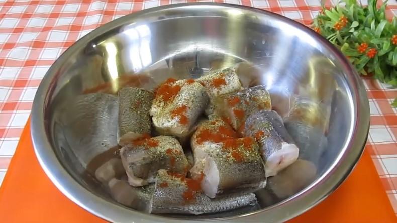 Солю, додаю мелений перець та обов’язково приправу для риби — вона містить ароматні спеції й сушені овочі, які ідеально підкреслюють смак. Додаю також сушений часник і копчену паприку — з ними страва виходить особливо смачною.