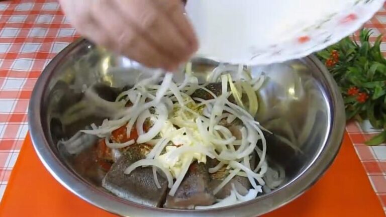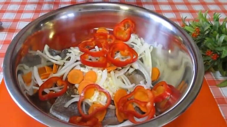 Переходжу до овочів. Цибулю нарізаю півкільцями й додаю до риби. Моркву ріжу кружальцями або півкільцями, солодкий перець — соломкою чи кільцями. Усе ретельно перемішую.