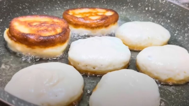 У трохи підігрітий кефір додаємо яйце, сіль, цукор і соду, добре перемішуємо вінчиком. За бажанням можна всипати дрібку ваніліну. Борошно просіюємо й поступово вводимо в масу, замішуючи густе, однорідне тісто. На сковороді розігріваємо 50–70 мл рослинної олії.