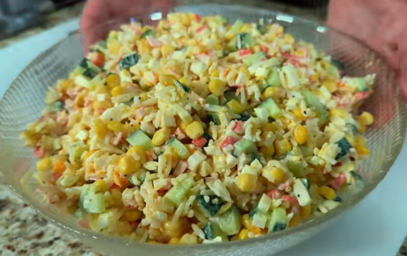 - Змішуємо рис, огірок, кукурудзу, яйця та крабові палички в салатнику. Заправляємо майонезом, солимо за смаком.