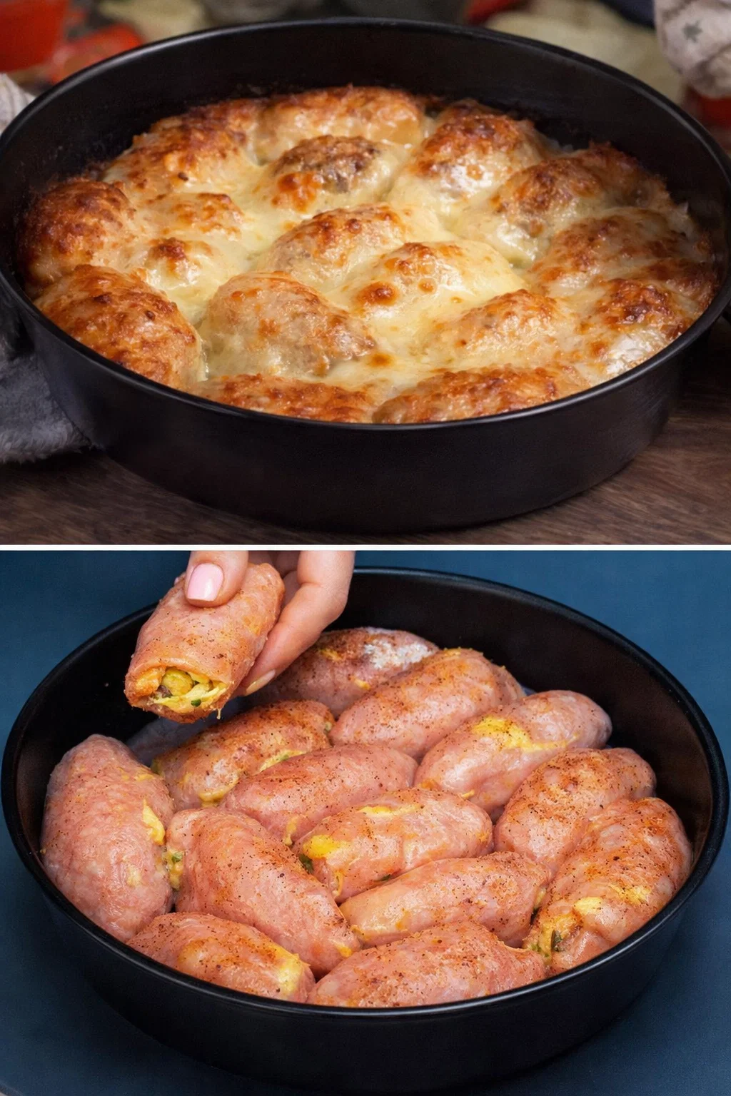 Запікаємо в духовці при температурі 180 °C протягом 30 хвилин. Решту моцарели натираємо, дістаємо рулети з духовки та посипаємо сиром зверху. Повертаємо в духовку ще на 10 хвилин, доки сир гарно підрум’яниться.