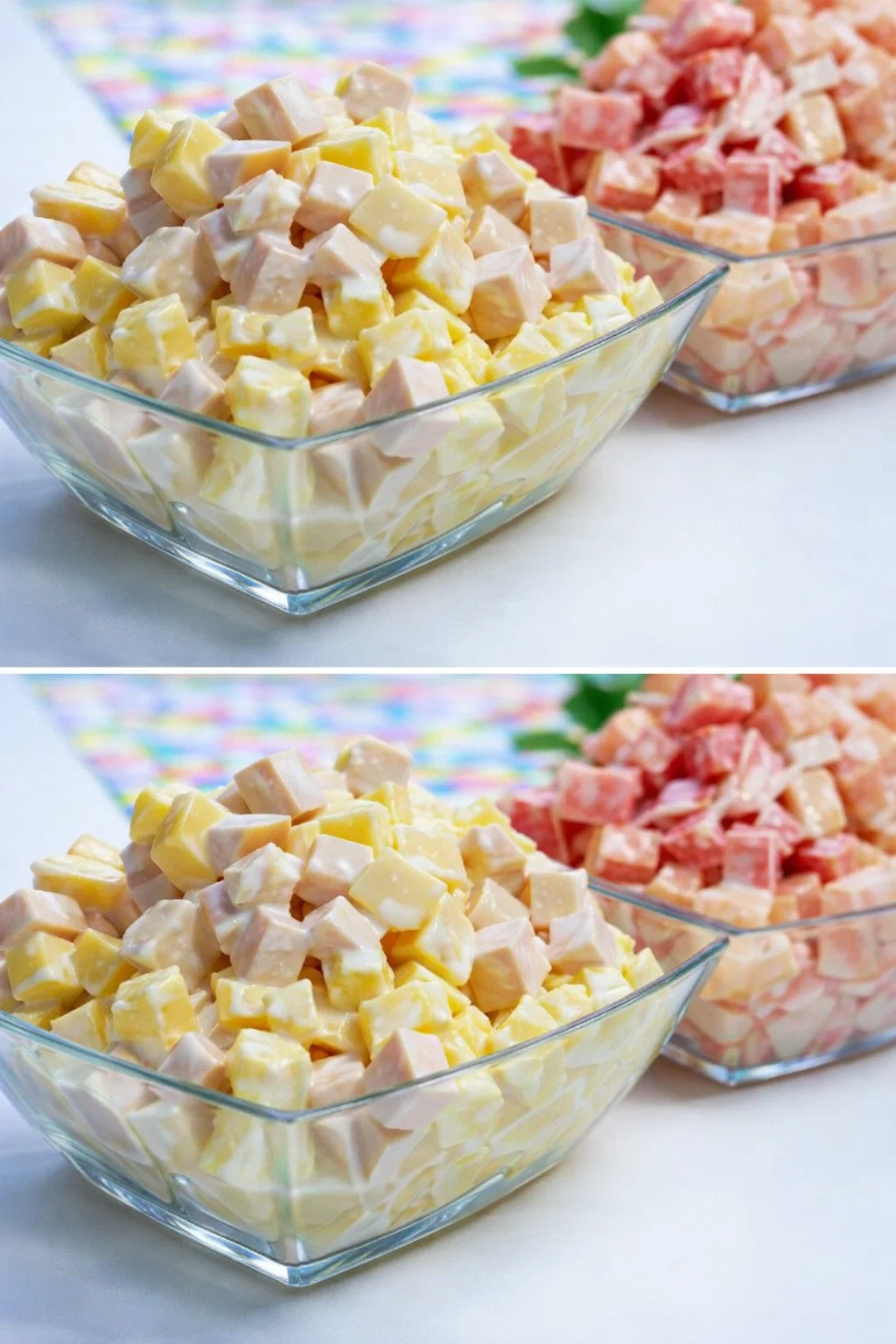 Твердий сир (200 г) та шинку (300 г) також нарізаємо кубиками.