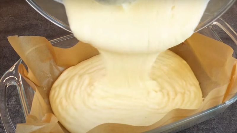 До манної суміші всипаємо розпушувач, перемішуємо, після чого вливаємо яєчну масу. Замішуємо густе тісто, виливаємо його у форму, застелену пергаментом.