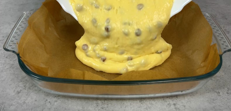 Форму застеляю папером для випікання, рівномірно розподіляю тісто. Розмір моєї форми — 29×22 см, висота — 6 см. Випікаю при 180 °C приблизно 40 хвилин.