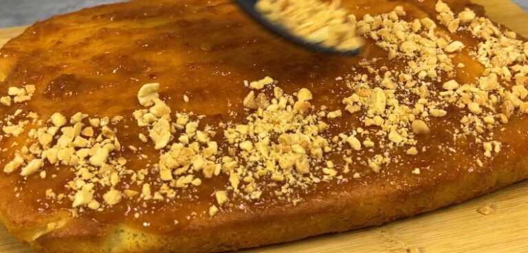 Готовий пиріг дістаю з форми, даю трохи охолонути, змащую зверху абрикосовим джемом і посипаю солоним арахісом. Помірна солодкість тіста ідеально поєднується з кисло-солодким джемом та солоним горіхом.