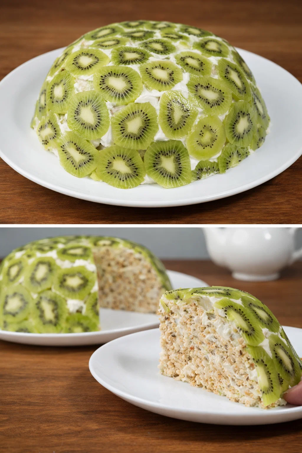 Глибоку круглу миску застеліть харчовою плівкою. Ківі очистіть і наріжте тонкими кружальцями. Викладіть у один шар, повністю заповнюючи дно та стінки миски.