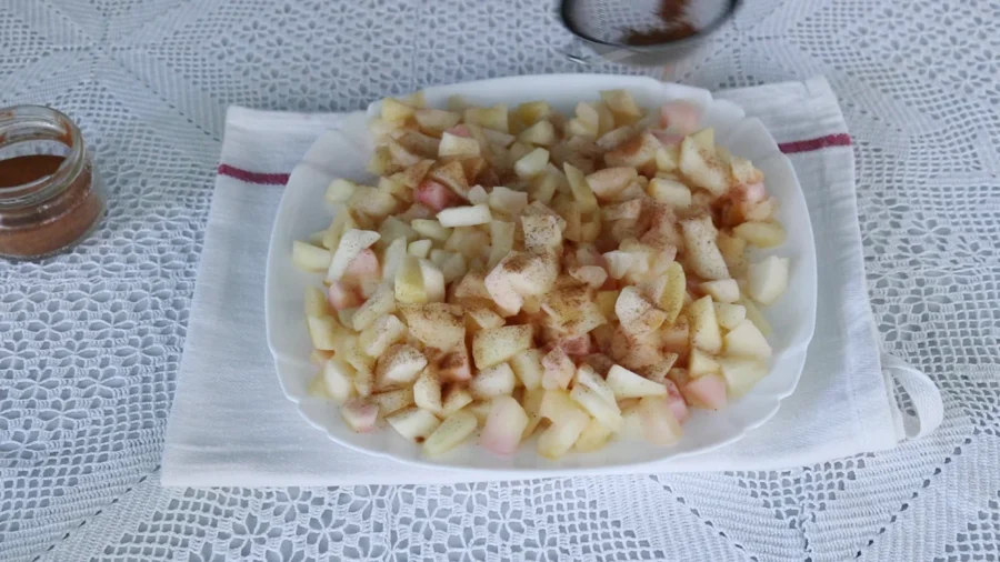 Якщо яблука дуже соковиті, викладаю їх на сито й даю стекти зайвому соку. Даю начинці охолонути та посипаю корицею за смаком.