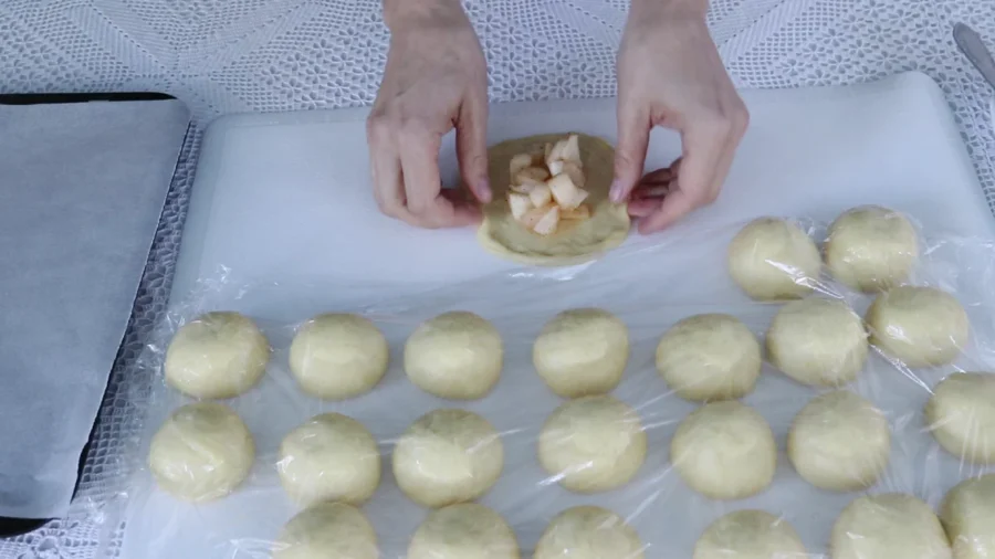 Кожну кульку розтягую, в центр викладаю 1 ст. л. яблучної начинки. Добре защипую краї, шов загладжую.