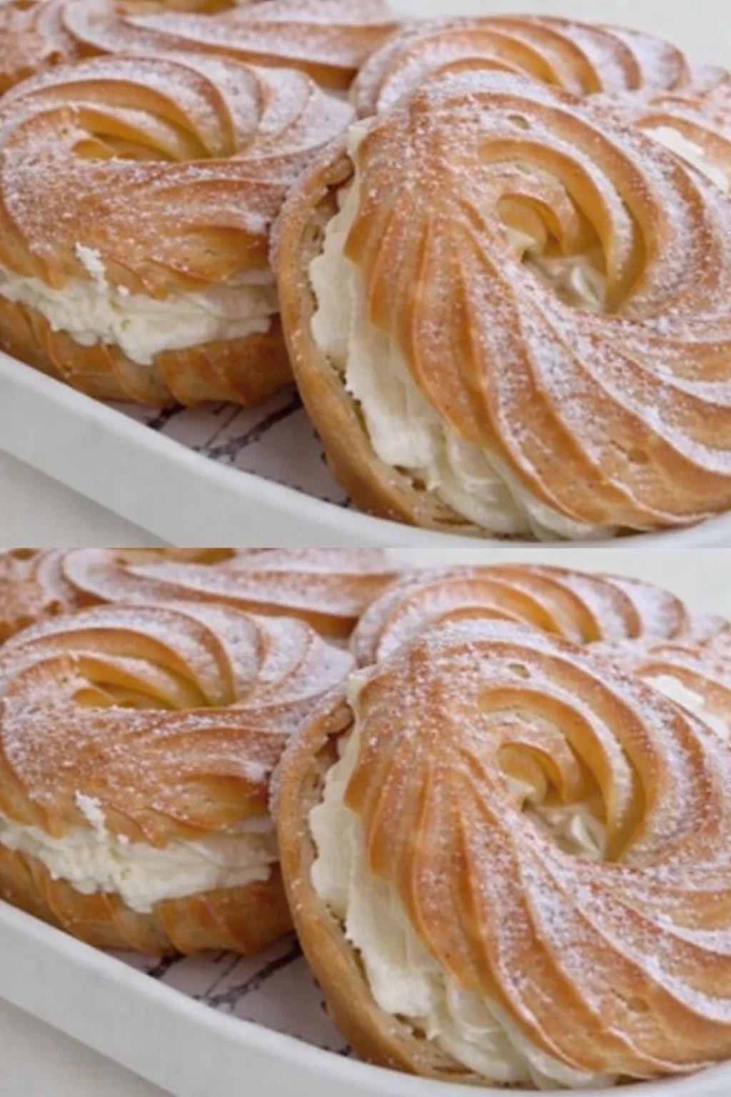 Готові кільця розріжте вздовж, наповніть кремом і присипте цукровою пудрою.