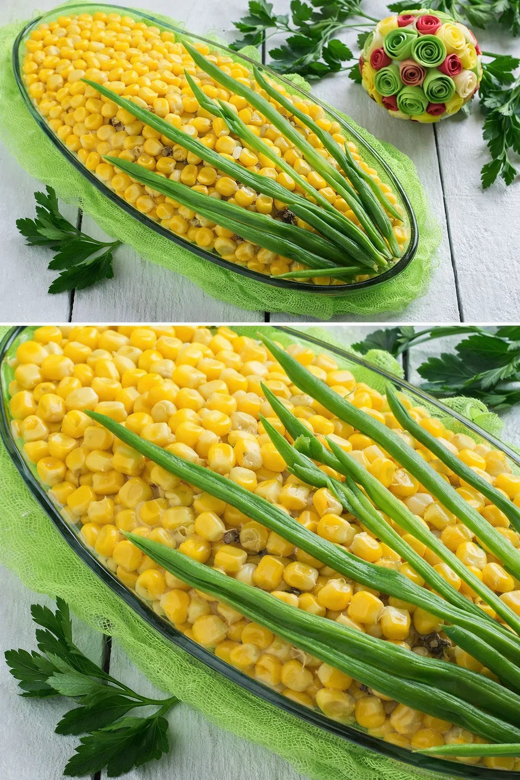 - Завершіть декоруванням кукурудзи та зеленими пір’ями цибулі.