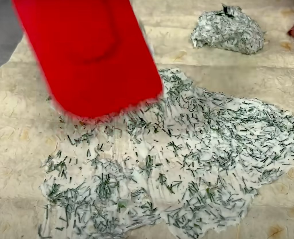 Один лист лаваша рівномірно змащуємо ароматною сметаною. Твердий сир натираємо на великій тертці й щедро посипаємо ним сметанний шар.
