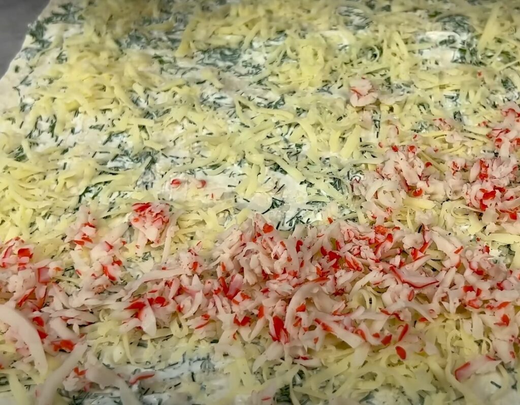 Крабові палички також натираємо на великій тертці та рівномірно розподіляємо поверх сиру.