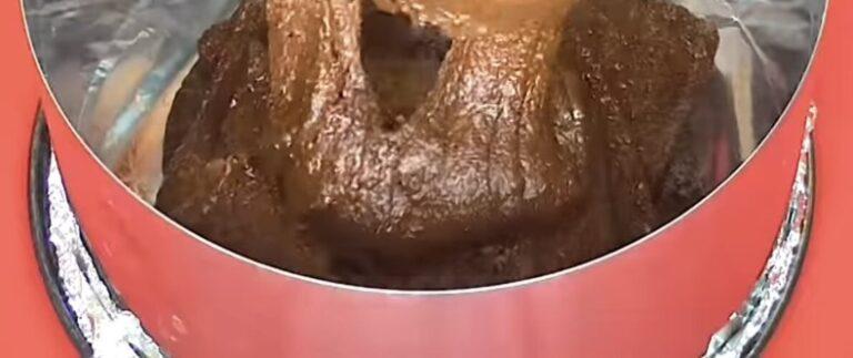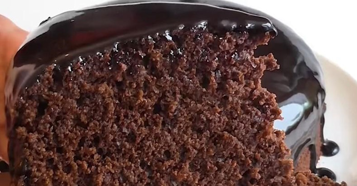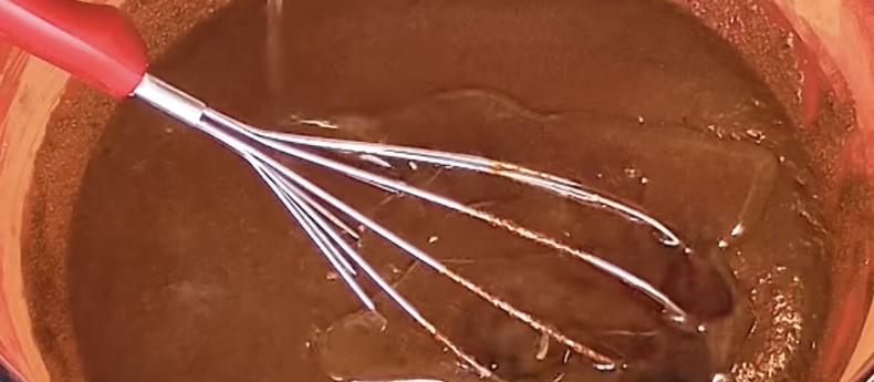 Для глазурі в сотейник висипаємо цукор і какао, додаємо олію та воду, добре перемішуємо і проварюємо на слабкому вогні близько однієї хвилини. Даємо глазурі трохи охолонути та поливаємо готовий пиріг. Якщо глазур тепла — на поверхні утворяться апетитні патьоки.