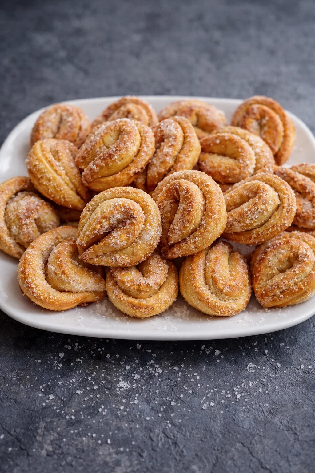 8️⃣ Кожен кружечок обмакнути однією стороною в цукор, скласти навпіл (цукром всередину), потім ще раз скласти, знову торкаючись цукром.
