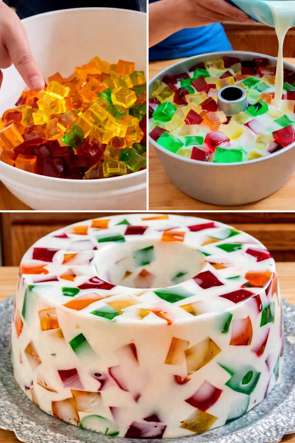 - Обережно з’єднайте сметанно-згущену суміш із кубиками желе.