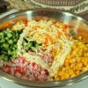 - Цибулю нарізаємо півкільцями, змішуємо з сіллю, цукром, оцтом і водою. Додаємо дрібно нарізаний кріп — маринуємо 15 хвилин.
