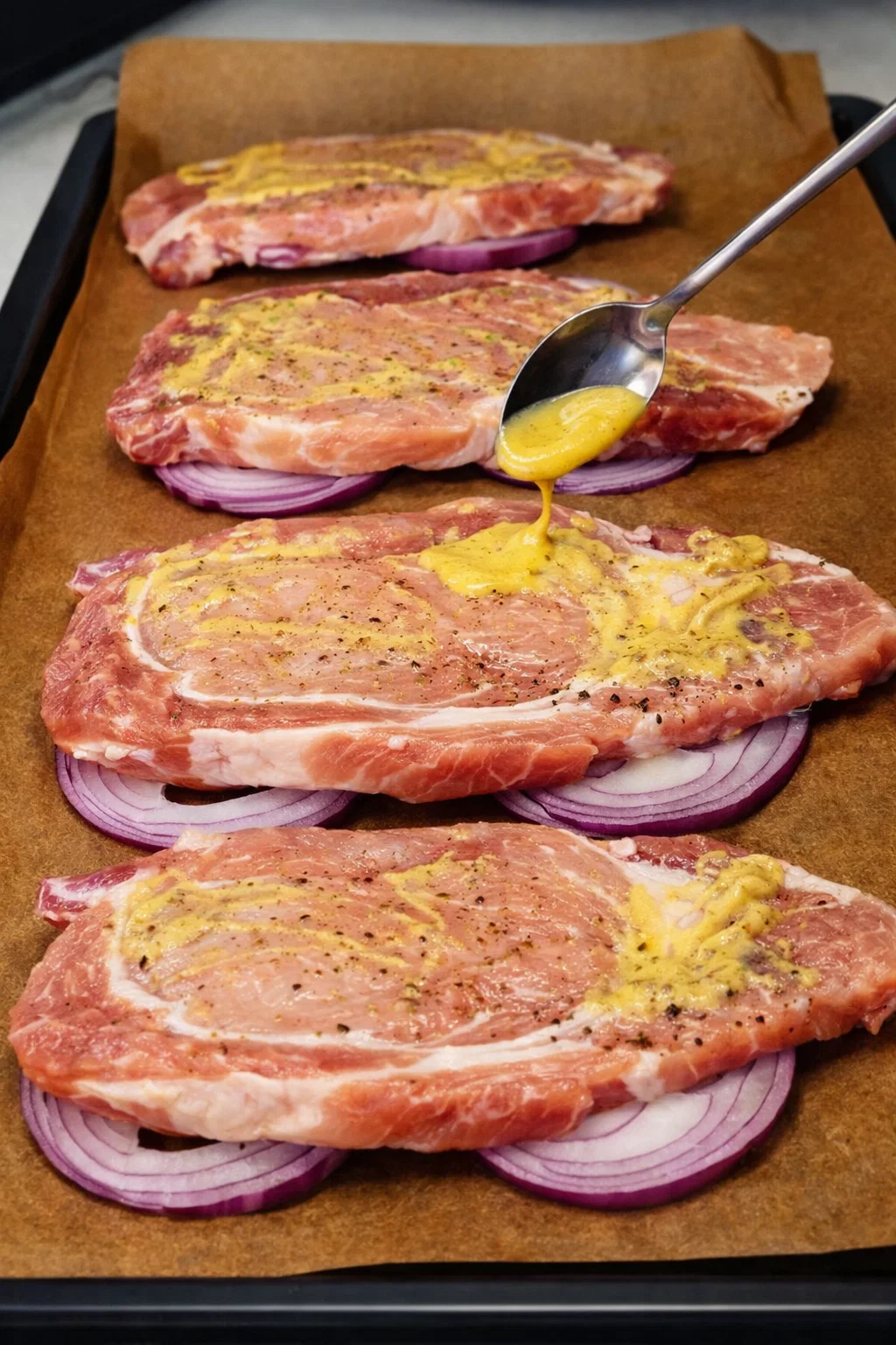 - Протвінь застеляємо пергаментом, викладаємо цибулю, а на неї — відбивні.