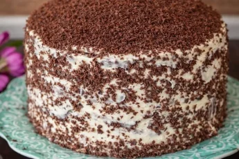 - Коржі змастити кремом, складаючи торт шарами. Верх і боки також покрити кремом, посипати крихтою з обрізків. Поставити в холодильник на кілька годин для просочення.