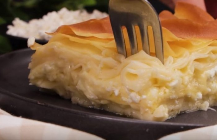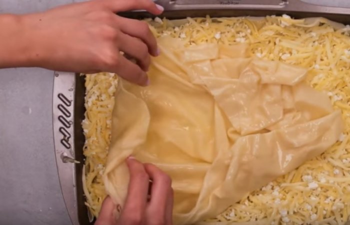 Сири натріть і змішайте між собою. Частину сирної суміші рівномірно розподіліть по тісту. Далі знову викладайте пласт тіста, змащуйте маслом, додавайте начинку — і так чергуйте шари до завершення інгредієнтів. Верхній шар має бути з тіста, його також потрібно змастити маслом.