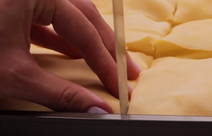 Форму розміром 35×20 см злегка змастіть маслом. Викладіть перший пласт тіста, збризніть його розтопленим маслом. Накрийте другим пластом і знову змастіть маслом. Так само викладіть третій шар.