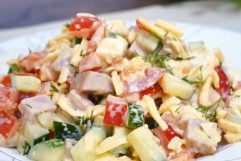Цей салат готується з традиційних інгредієнтів, але завдяки копченому курячому філе він набуває легкої